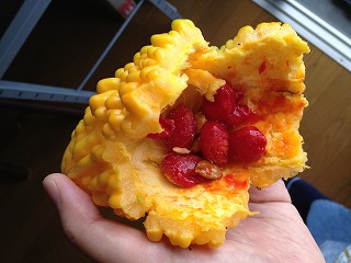 投稿日: 2012年9月24日2015年12月12日 投稿者: motohiro甘ーいゴーヤもあり? こんにちは。ゴーヤです。 ゴーヤは熟すと黄色くなって、弾けます。 中にはこんな真っ赤な果肉に包まれた種が入っておりまして、この赤ーいのを食べると甘ーいのです。 口が真っ赤になるほど赤いのです。 普通は緑色の黄色い皮と言いますかその部分は苦味がないそうですが、怖くて食べてません。